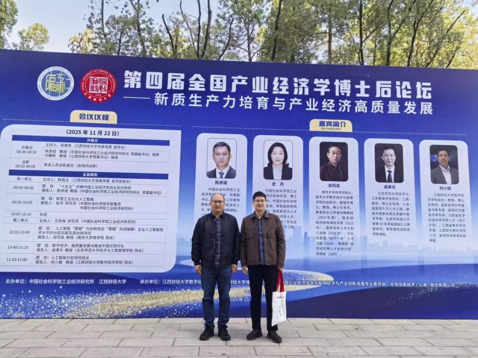 11月22日,第四届全国产业经济学博士后论坛在南昌举行。本次论坛以“新质生产力培育与产业经济高质量发展”为主题,论坛由中国社会科学院工业经济研究所与江西财经大学联合主办,江西财经大学数字经济学院、江西财经大学博士后科创中心、中国工业经济学会互联网经济与产业创新发展专业委员会等承办,论坛邀请来自中国社会科学院、南京大学、北京师范大学等高校及科研机构的专家学者、教师及相关专业研究生参与研讨,我院曾浩、彭永樟两位教师应邀参会。